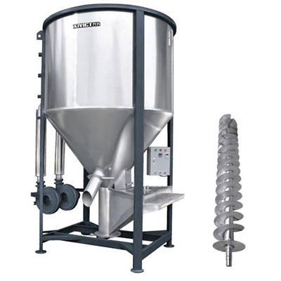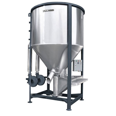 大型立式混料機,采用螺旋攪拌工作之原理,將投入投料斗中的物料通過螺旋主軸翰送到桶體上端,再以傘狀形落下且一直持續循環攪拌,從而達到混合均勻的目的。